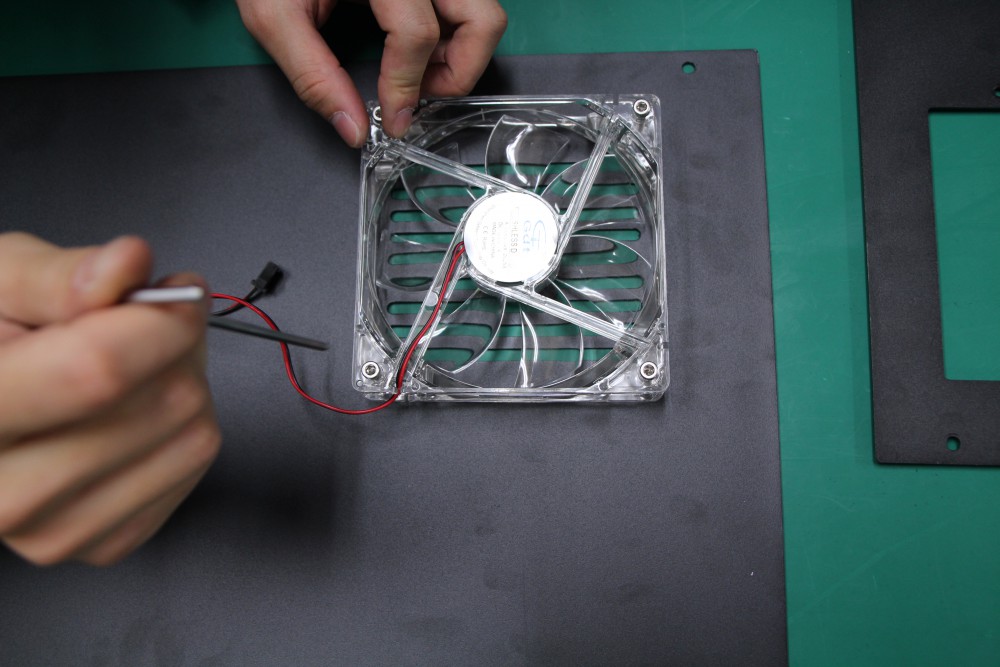 Cover rightに透明DCファンをM4×30 六角穴付ボルトで取り付けます。