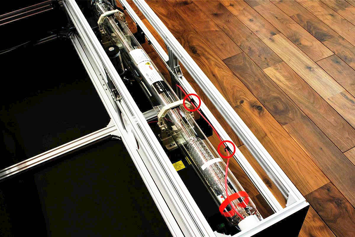 80mmの水冷ホースをレーザー管の照射口側のホース接続口と[99]フローセンサーに取り付けます。[99]フローセンサーには向きがあり、[99]フローセンサー本体に矢印がついています。