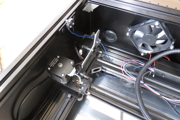 正面から見て左側にあるX軸ステッピングモーターのケーブル(X-Axisケーブル)を写真を参考にアルミフレームの溝に入れます。