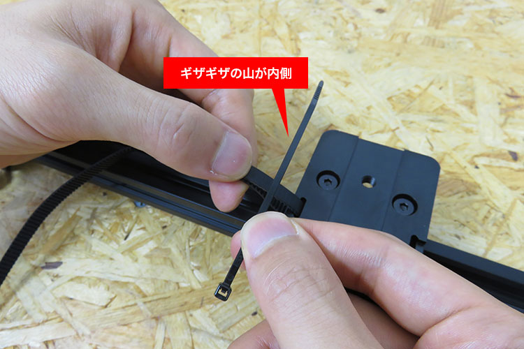 結束バンドのギザギザの山が内側に来るようにしてください。逆になってしまった場合は、結束バンドが機能しません。