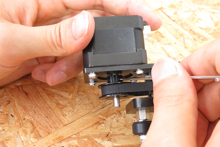 次に、タイミングベルトをしっかりと張るために、一度「X軸モーターユニット」を固定しているねじを緩め、以下の写真の方向に引っ張りながら再度ねじを締めなおします。